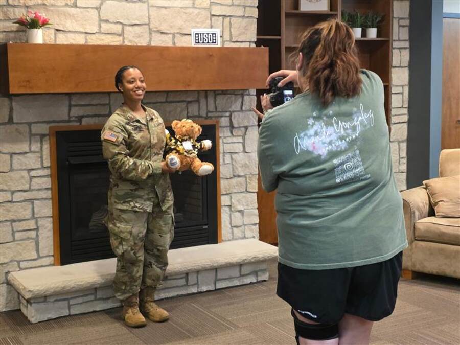 Sgt. Farmer poses for a photo at the USO Center with the bear her daughter will keep while she is on deployment.